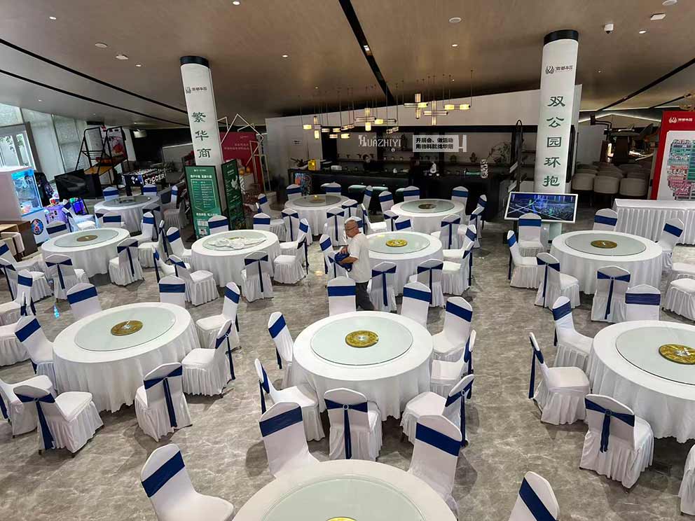 開封桌椅租賃為購房活動配置的大圓桌,從尺寸到功能都深度契合洽談需求。圓桌直徑統一為 1.8 米,可輕松容納 6-8 人圍坐,既避免了長條桌“主次分明” 的距離感,又能讓客戶與置業顧問面對面平等交流,拉近溝通距離,更利于購房細節的深入探討。桌面中央的轉盤采用靜音軸承設計,轉動時平穩無噪音,方便放置項目資料、戶型模型、飲品果盤等,客戶無需起身便能輕松取用,提升洽談的便利性。